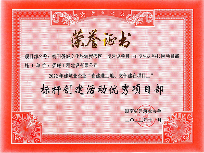 2022年衡陽僑城文化旅游度假區(qū)一期生態(tài)科技園項(xiàng)目標(biāo)桿創(chuàng)建活動(dòng)優(yōu)秀項(xiàng)目部榮譽(yù)證書