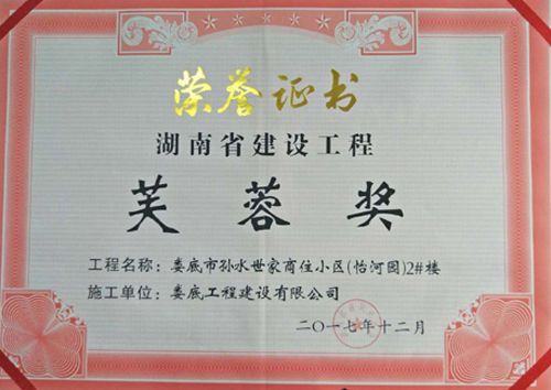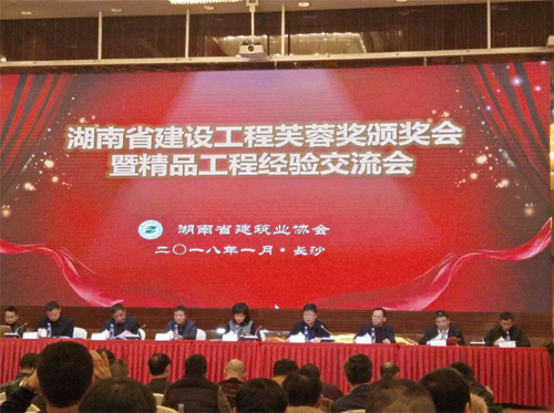 2018年1月19日,由湖南省建筑業(yè)協(xié)會舉辦的湖南省建設工程芙蓉獎頒獎會暨精品工程經(jīng)驗交流會在長沙舉行。我司承建的婁底市孫水世家商住小區(qū)(怡河園)2#樓獲得湖南省建設工程質(zhì)量最高獎—“芙蓉獎”殊榮。這是我司自市農(nóng)業(yè)銀行綜合樓、市委市人民政府辦公樓1#、6#、7#、雙峰縣體育中心體育館喜獲“芙蓉獎”后,第四次獲得“芙蓉獎”殊榮。