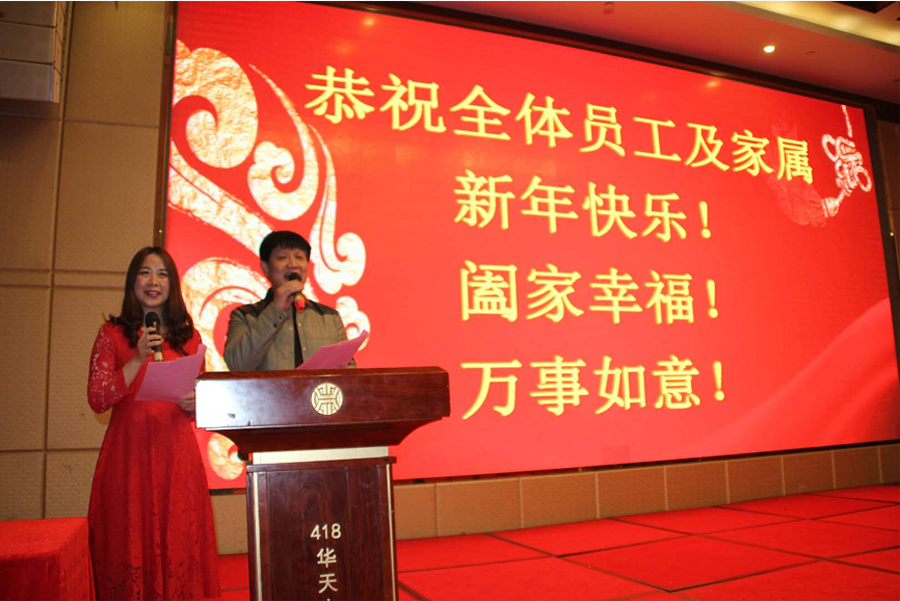 主持人羅堅、鄧迎雨向全體員工家屬祝賀新年