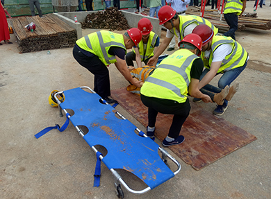 本次模擬情景是在項(xiàng)目東南側(cè)基坑墊層施工中,南側(cè)-5m處6名施工人員在平整土方時(shí)邊坡土體突然坍塌,工人張某被滑落土方掩埋。該路段土質(zhì)屬于回填土,邊坡上部可能有繼續(xù)坍塌的趨勢(shì)。項(xiàng)目經(jīng)理即刻啟動(dòng)了應(yīng)急救援預(yù)案。救援組所有成員攜帶救援工具趕到事故現(xiàn)場(chǎng),通迅組人員立即向相關(guān)領(lǐng)導(dǎo)及主管部門報(bào)告事故情況并請(qǐng)求支援。